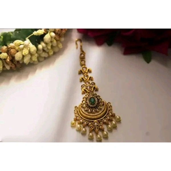 This is a beautiful temple jewellery maangtikka with cz stones and pearls embedded.