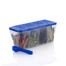 Multipurpose Plastic 4 In 1 Masala Box for Kitchen, Transparent Pickle Box, 4 Compartment Storage Container Airtight For Cereal, Dry Fruits Dabba With Spoon-Blue(1 Pcs)