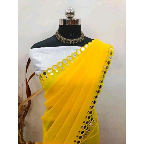 This is a Faux Georgette Plastic Mirror work Party Wear Saree.This Saree comes with an attached Art Silk blouse fabric which can be customised from 32" to 42